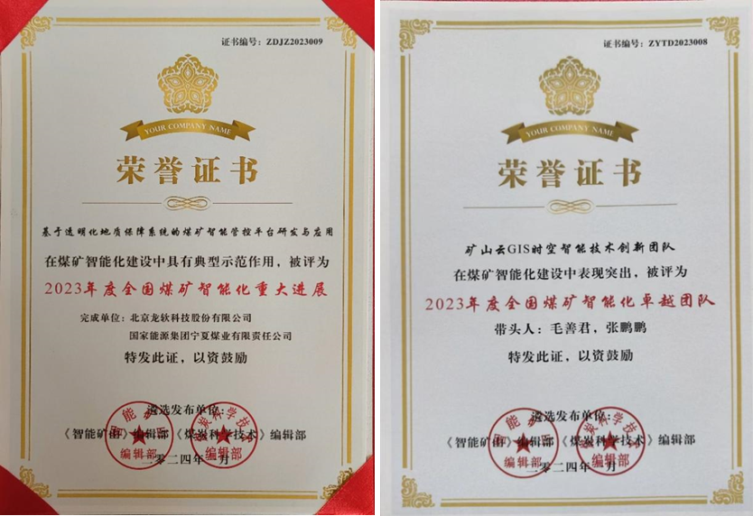 龍軟科技受邀參加會(huì)議并獲得兩項(xiàng)榮譽(yù),其中“基于透明化地質(zhì)保障系統(tǒng)的煤礦智能管控平臺(tái)研發(fā)與應(yīng)用”被評(píng)為2023年度全國(guó)煤礦智能化重大進(jìn)展,“礦山云GIS時(shí)空智能技術(shù)創(chuàng)新團(tuán)隊(duì)”被評(píng)為2023年度全國(guó)煤礦智能化卓越團(tuán)隊(duì)。