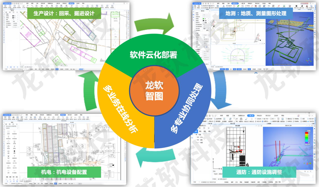 除了專業(yè)機電設(shè)備和環(huán)境監(jiān)測系統(tǒng)的生產(chǎn)外,龍軟科技-北大團隊已經(jīng)成為國內(nèi)外煤礦智能化建設(shè)自主產(chǎn)業(yè)鏈較為完整的團隊之一,從采掘透明化探測、礦山“采、掘、機、運、通”和“水、火、瓦斯、頂板”多維專題圖形的處理、透明化地測保障系統(tǒng)、基于透明化地測的管控平臺,到智能化綜掘、智能化綜采、智能化通風(fēng)、智能化洗選,都有專門的研發(fā)和實施團隊,而且成果眾多。智能化礦山建設(shè)產(chǎn)業(yè)鏈的重要基礎(chǔ)是透明化地測保障系統(tǒng),而透明化地測保障系統(tǒng)的基礎(chǔ)就是能夠處理各類專題圖形的GIS軟件系統(tǒng)。