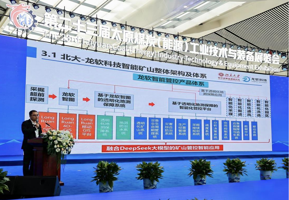 在展會期間,公司副總工程師兼智能礦山安全技術(shù)研究院院長景超先生,應(yīng)邀在煤炭綠色智能開采技術(shù)交流活動中作了題為《高級智能化煤礦建設(shè)發(fā)展戰(zhàn)略思考和系統(tǒng)設(shè)計》的專題報告。景超院長在報告中深入闡述了龍軟科技與北京大學(xué)團隊在智能化煤礦建設(shè)領(lǐng)域的創(chuàng)新成果與實踐經(jīng)驗,提出了構(gòu)建高級智能化礦井的6626工程,并展示了團隊在礦山時空大模型、煤礦裝備智能化、地質(zhì)測量透明化、數(shù)據(jù)分析在線化、智能系統(tǒng)集成化、控制協(xié)同化以及生產(chǎn)過程綠色化等方面取得的卓越成就;并重點介紹了基于人工智能時空大模型的智能決策技術(shù),以及該技術(shù)在地質(zhì)保障系統(tǒng)、智能管控平臺、調(diào)度決策支持系統(tǒng)等方面的落地應(yīng)用。