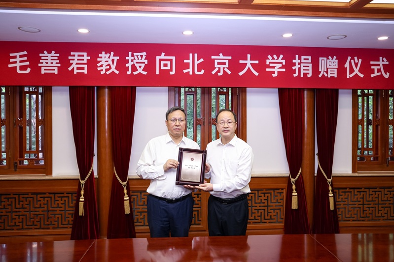 何光彩書記向毛善君董事長頒發(fā)了“北京大學(xué)杰出教育貢獻(xiàn)獎(jiǎng)”