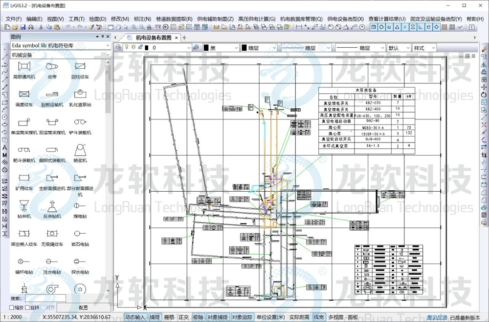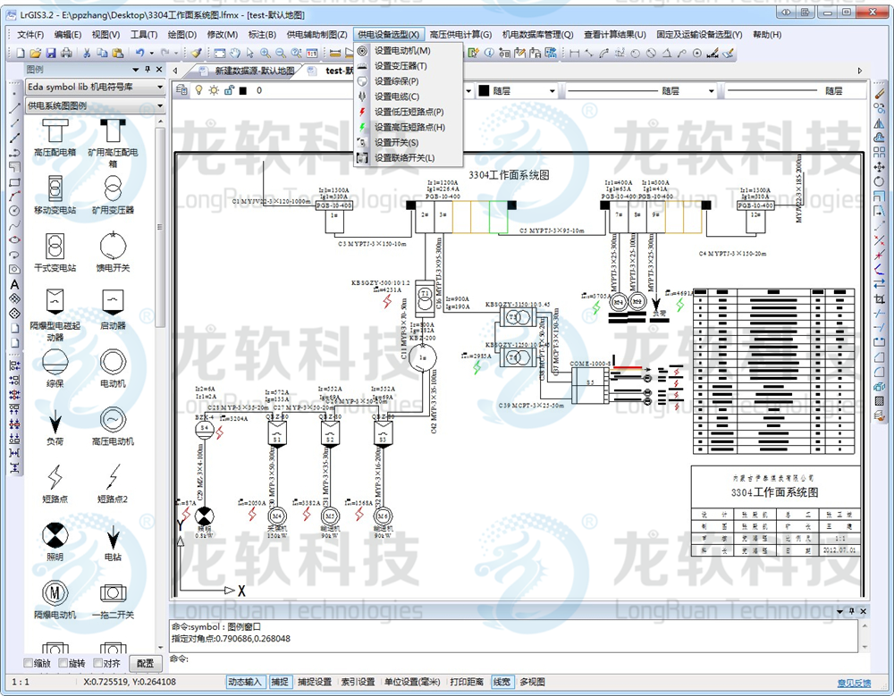 供電設(shè)計圖形協(xié)同管理系統(tǒng)包括機電圖形協(xié)同管理、供電設(shè)備選型計算和固定設(shè)備選型計算等模塊。機電圖形協(xié)同管理是基于一張圖管理模式,以在線協(xié)同的方式設(shè)計運輸系統(tǒng)圖、設(shè)備布置圖、供排水系統(tǒng)圖、通訊聯(lián)絡(luò)系統(tǒng)圖、人員定位系統(tǒng)圖、供電系統(tǒng)圖等機電圖形。供電設(shè)備選型計算是基于標(biāo)準(zhǔn)的供電設(shè)備圖例庫繪制供電系統(tǒng)圖,對電動機、變壓器、電纜、各類開關(guān)進行相應(yīng)的供電計算與校驗,從設(shè)備參數(shù)數(shù)據(jù)庫選出合適的供電設(shè)備,并自動生成供電設(shè)計報告。固定設(shè)備選型計算是對輔助運輸巷絞車、運輸機、排水等設(shè)備進行選型計算,選出合適的設(shè)備,生成相應(yīng)的設(shè)備選型設(shè)計報告。