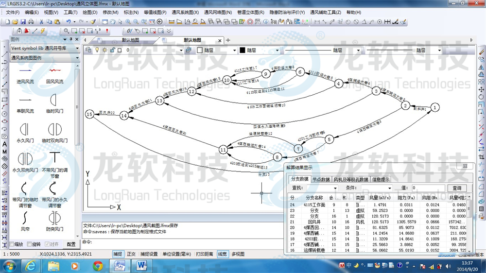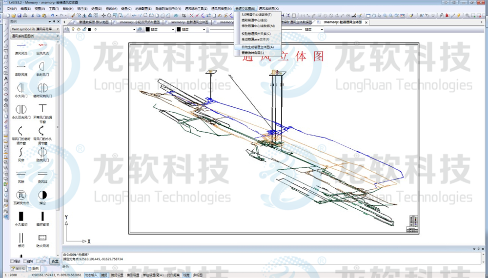 通防圖形協(xié)同管理系統(tǒng)主要包括通風(fēng)制圖和通風(fēng)系統(tǒng)仿真等模塊。通風(fēng)制圖包括繪制通風(fēng)系統(tǒng)圖、避災(zāi)路線圖、注漿系統(tǒng)圖、瓦斯抽放系統(tǒng)圖、瓦斯抽放曲線圖、防塵系統(tǒng)圖、防火系統(tǒng)圖、監(jiān)測監(jiān)控系統(tǒng)圖,自動生成通風(fēng)系統(tǒng)立體圖、通風(fēng)網(wǎng)絡(luò)圖、通風(fēng)系統(tǒng)壓能圖;通風(fēng)系統(tǒng)仿真主要包括通風(fēng)阻力測定數(shù)據(jù)的錄入和處理,通風(fēng)網(wǎng)絡(luò)模擬解算,通風(fēng)系統(tǒng)風(fēng)量調(diào)節(jié),風(fēng)機優(yōu)化選型等功能。