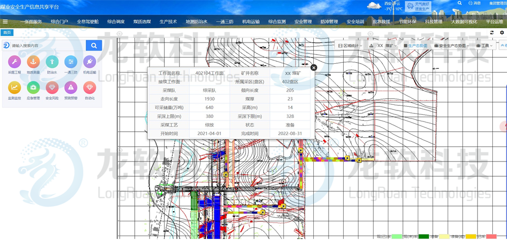 (3)基于“一張圖”實(shí)現(xiàn)對煤礦生產(chǎn)調(diào)度、采煤掘進(jìn)、一通三防、機(jī)電運(yùn)輸、地測防治水、資源儲量、安全、培訓(xùn)、環(huán)保、科技、黨建、企業(yè)文化、智能監(jiān)控等業(yè)務(wù)數(shù)據(jù)的綜合集成、可視化展示與智能化管理。