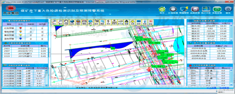 基于煤礦水、火、瓦斯和頂板等安全監(jiān)控系統(tǒng),實(shí)現(xiàn)重大危險(xiǎn)源在線檢測,實(shí)時(shí)采集重大危險(xiǎn)源數(shù)據(jù),建立重大危險(xiǎn)源指標(biāo)體系庫,運(yùn)用先進(jìn)的預(yù)警模型,實(shí)現(xiàn)對煤礦井下水、火、瓦斯和頂板等重大危險(xiǎn)源的集成管理和超前預(yù)警。提高煤礦重大危險(xiǎn)源預(yù)警能力,降低重大危險(xiǎn)源事故發(fā)生率,進(jìn)而提高煤礦整體安全管理水平。
